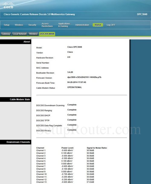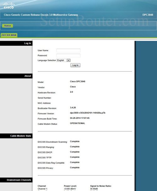 With the cisco advanced wifi modem you have access to two wifi networks including a 2 4 ghz network and 5 0 ghz network. The default cisco dpc3848 router username is. The cisco dpc3848 is a docsis 3 0 gateway modem. However some differ as shown in the table below.