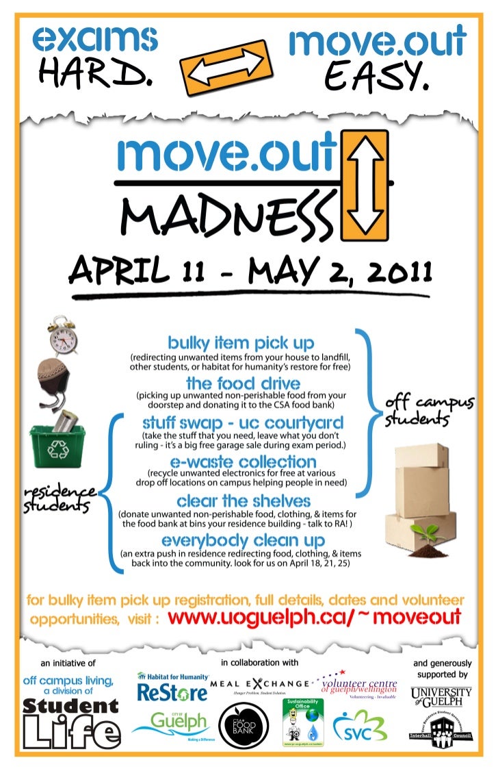 Part of move out madness this program will take all of your bulky items off your hands. Move out madness is designed to help university of guelph students redirect unwanted furniture and large items food and clothing to community agencies recycling facilities or student reuse the move out madness program provides clothing and food donations to the local foodbanks and free large item pick ups for off campus students at the end of every academic year. Move out madness is designed to help university of guelph students redirect unwanted furniture and large items food and clothing to community agencies recycling facilities or student reuse. Published on apr 11 2018 apr 14 2018 by adam a.